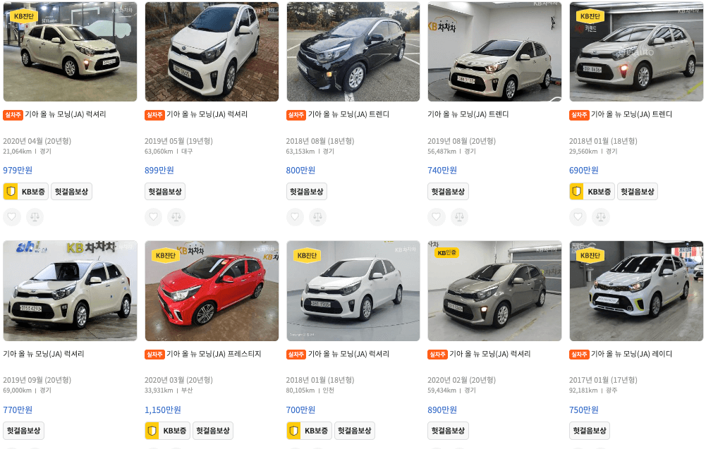 KB차차차 등록 모닝 중고차 가격