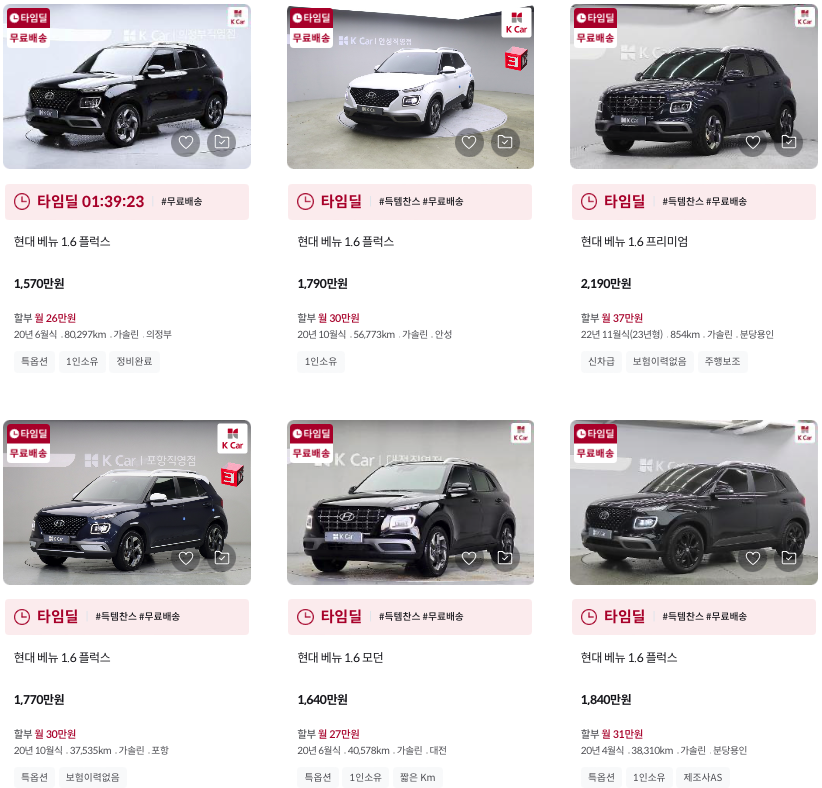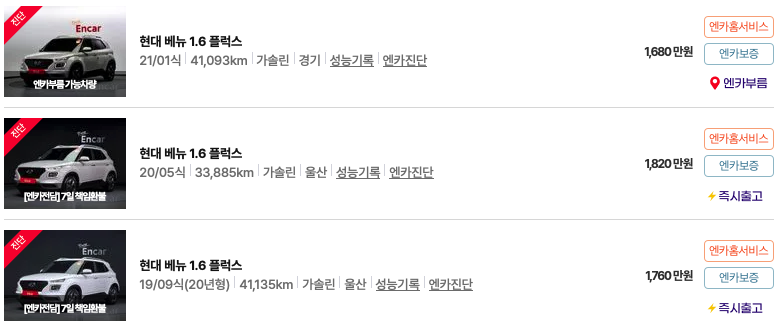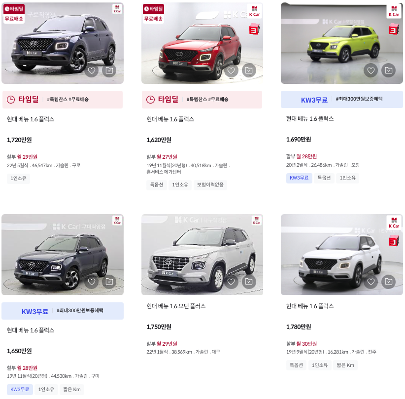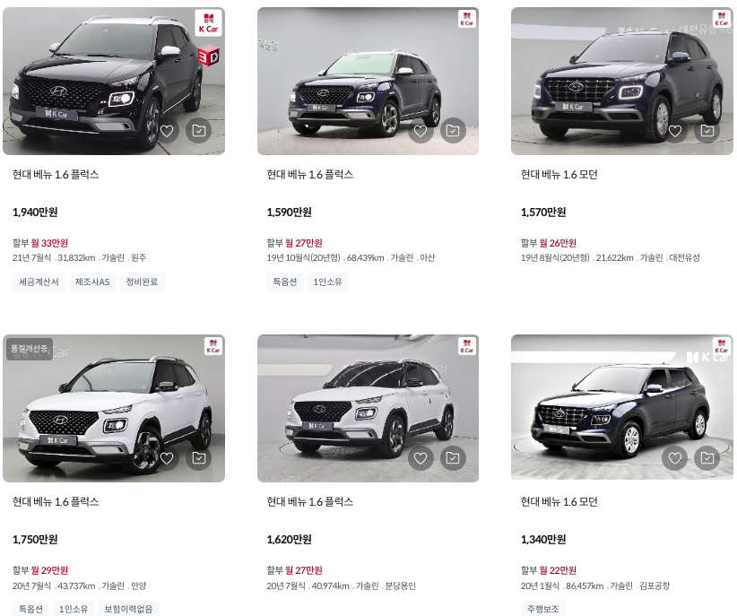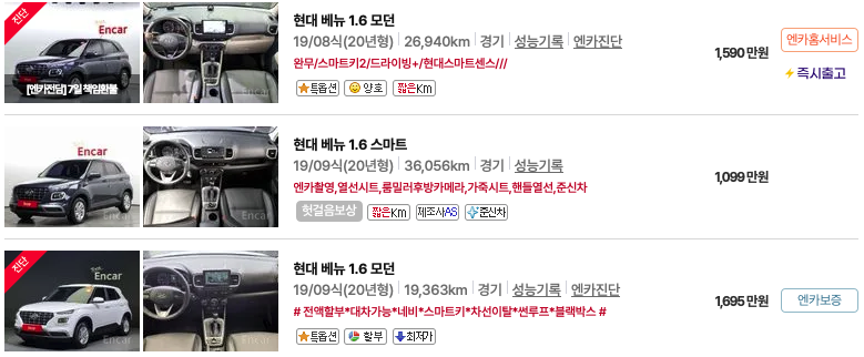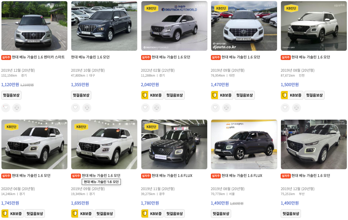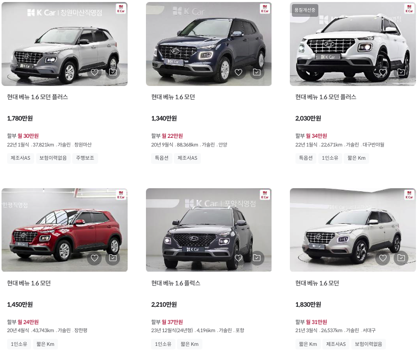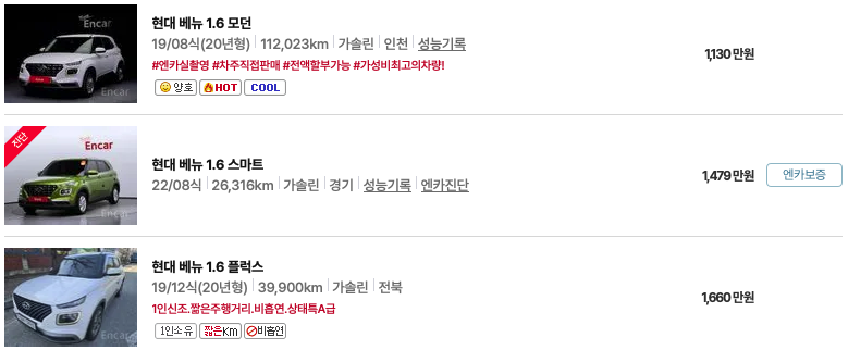 베뉴의 모델별, 연식별 중고차 가격과 시세표입니다.