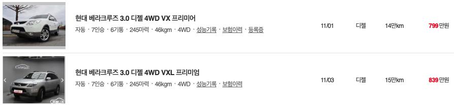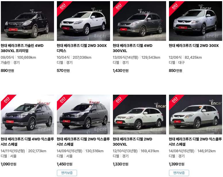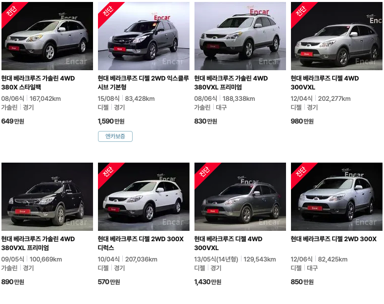 엔카 등록 베라크루즈 중고차 가격