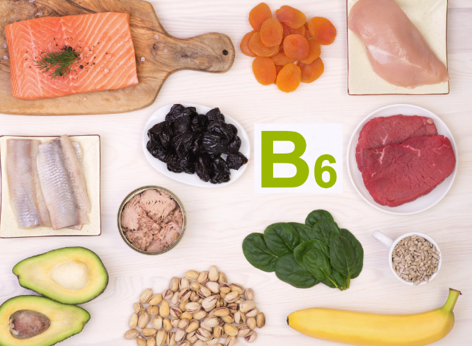 비타민 B6는 고기, 생선, 감자, 비타민 B6가 강화된 시리얼, 바나나, 견과류와 같은 식품에 풍부합니다. 이 비타민은 특히 면역 기능과 단백질 대사에 중요합니다.