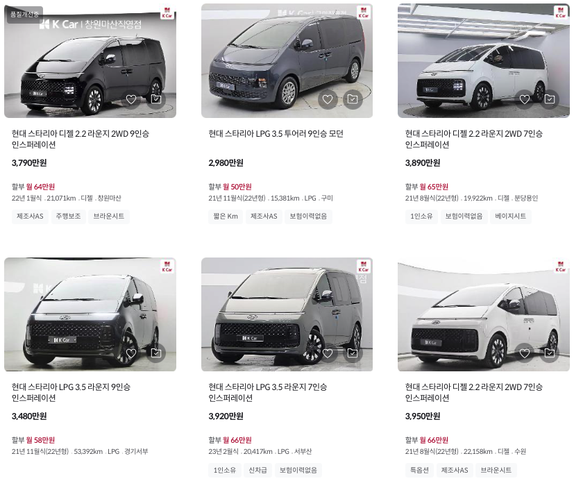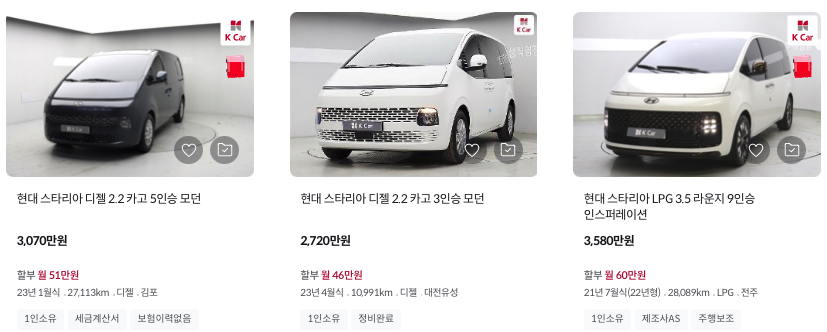 K카 등록 스타리아 중고차 가격