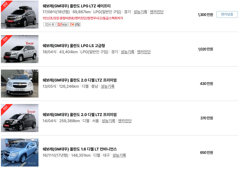 엔카 올란도 중고차 가격