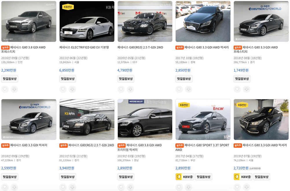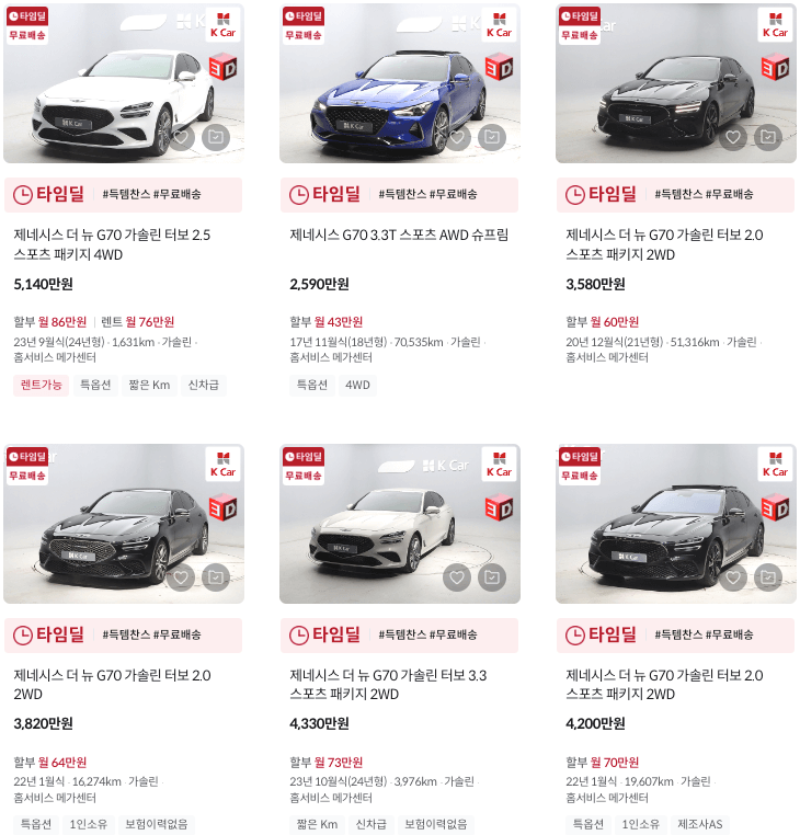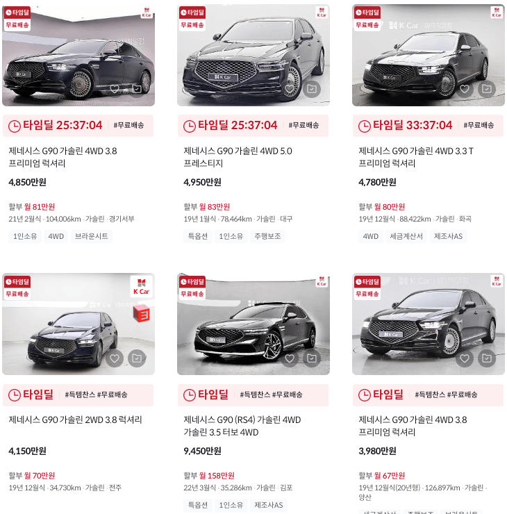 K카 제네시즈 중고차 가격 : G70 G80 G90