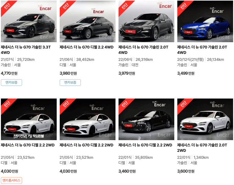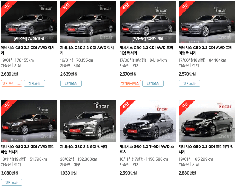 엔카 등록 제네시즈 중고차가격 : G70 G80 G90
