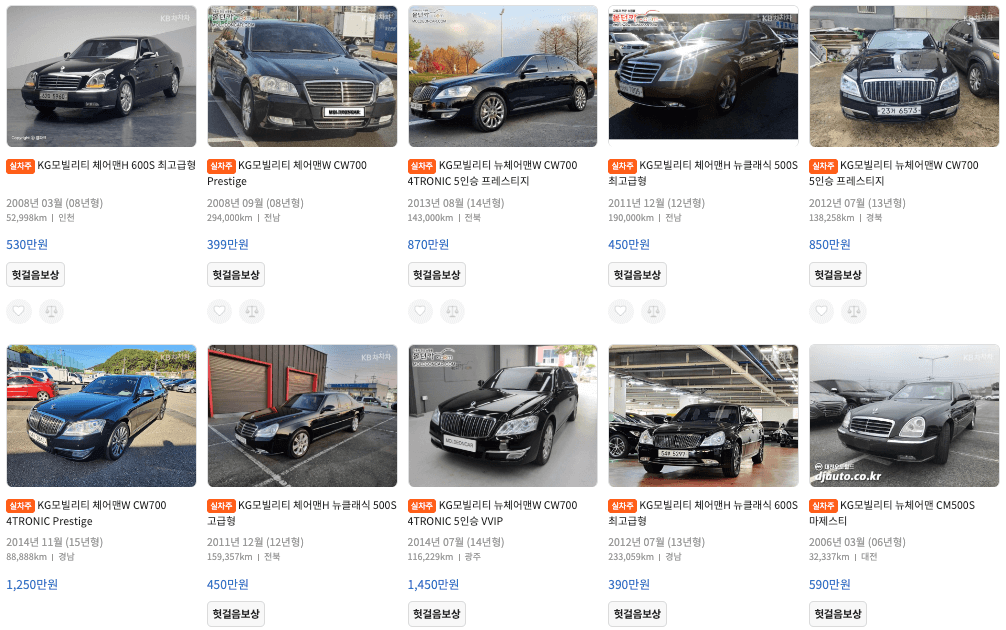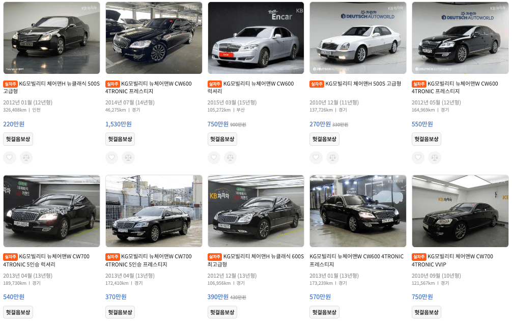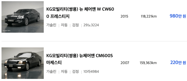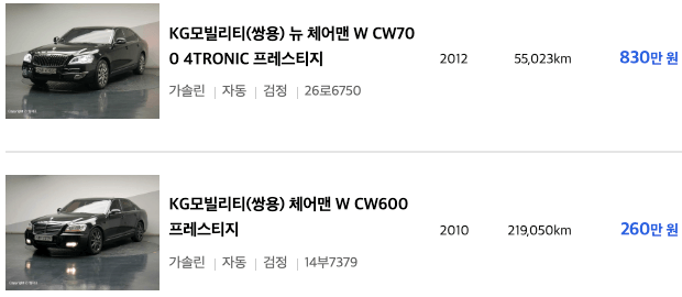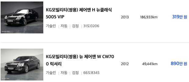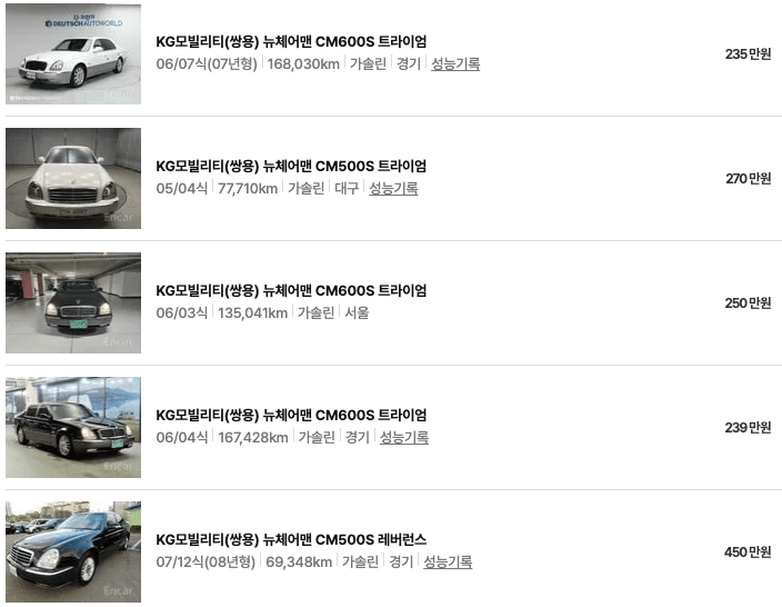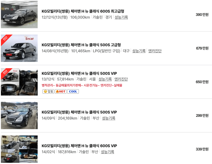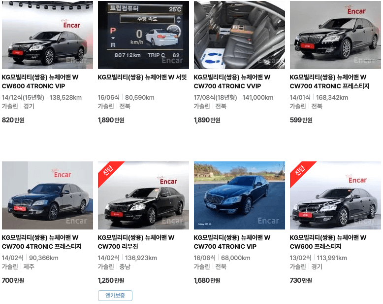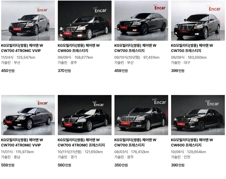 쌍용 체어맨의 연식별, 모델별 각각 시세표와 중고차 사이트 엔카, KB차차차, 다나와자동차에 등록되어 있는 일부 매물을 공유합니다.