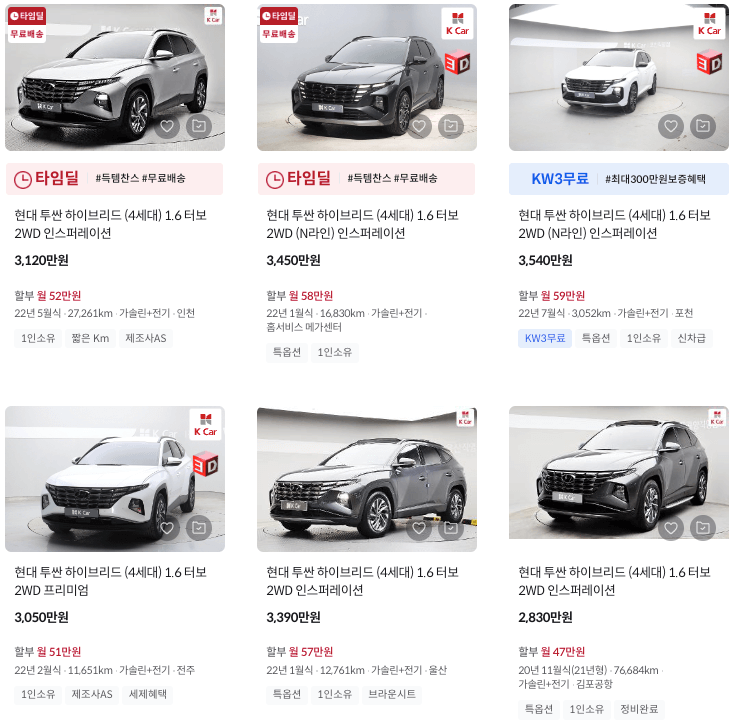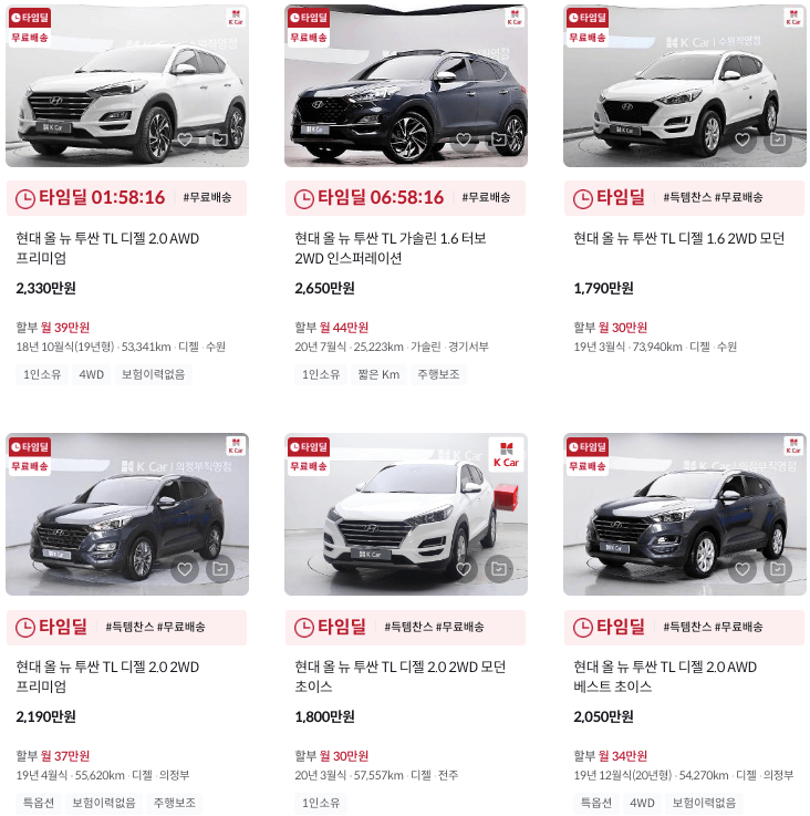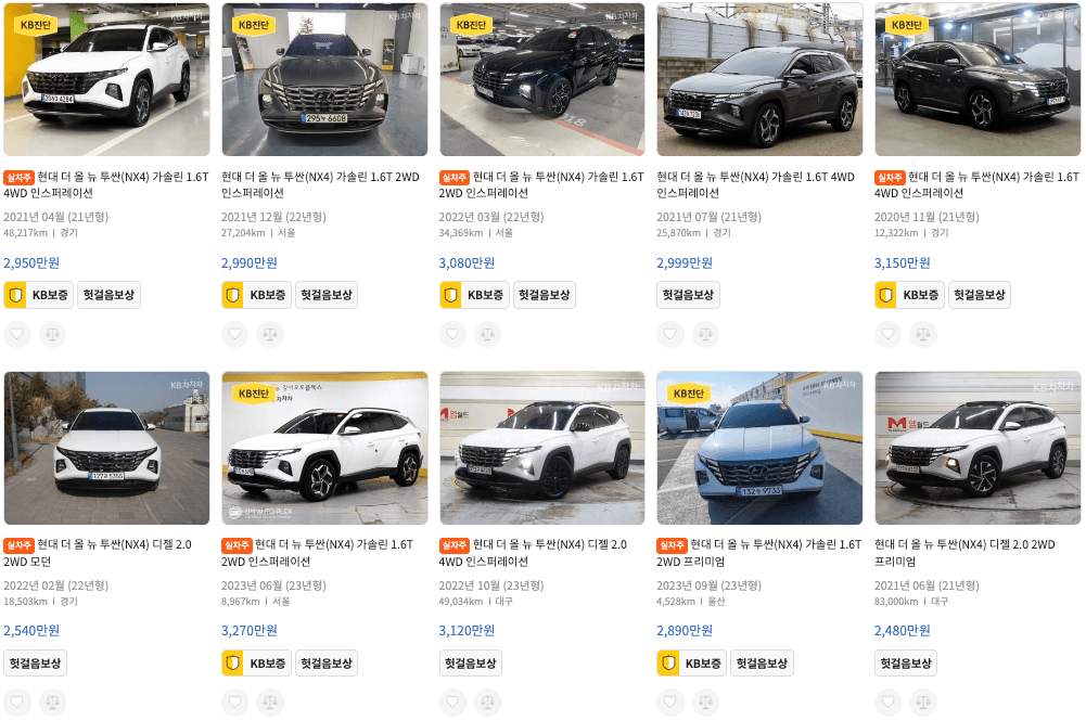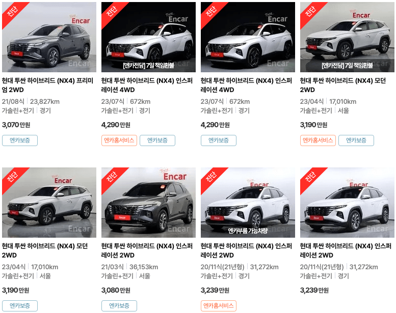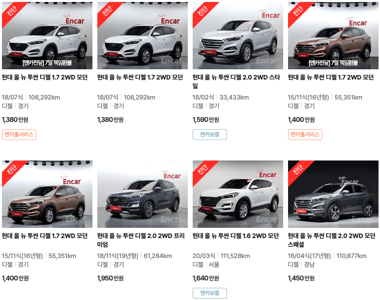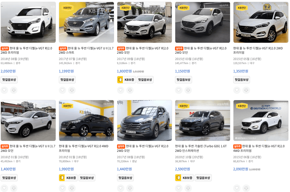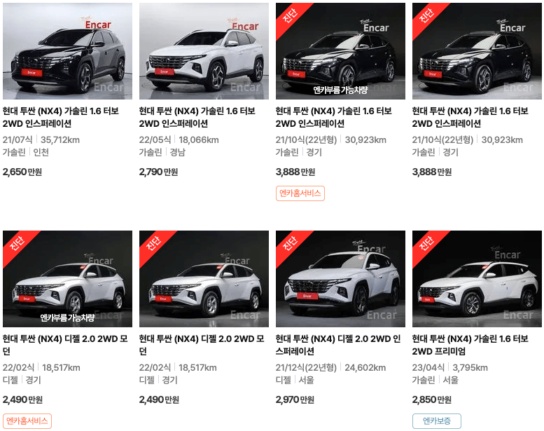 투싼 중고차 시세와 중고 사이트에 올라와 있는 매물을 가져와 봤습니다. 중고 구입 예정이라면 시세 확인은 필수이고, 매물 가격이 어느 정도인지 확인해보면 좋겠죠.