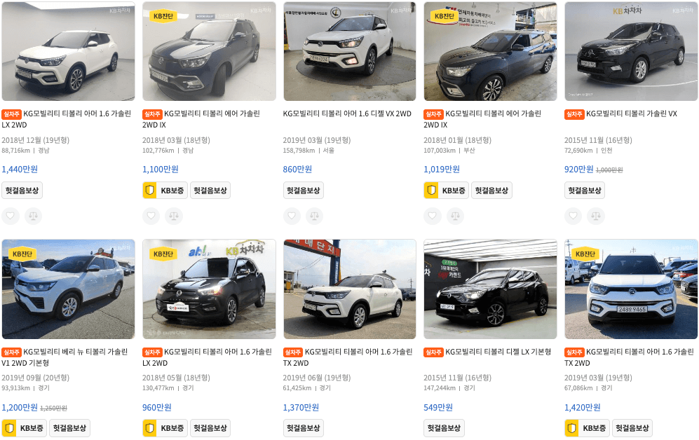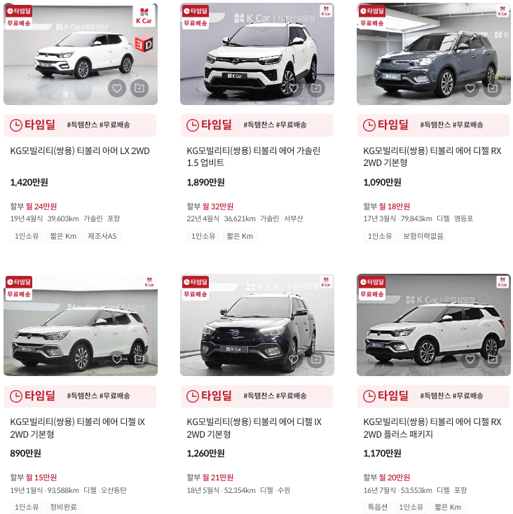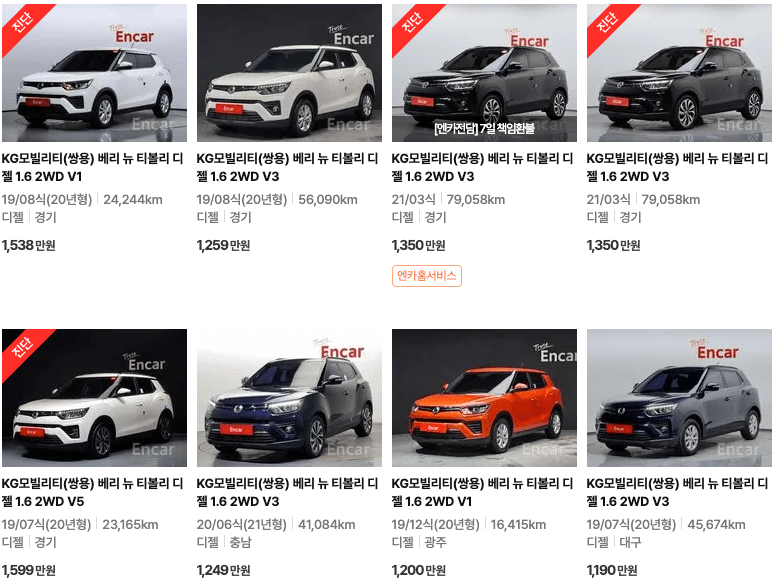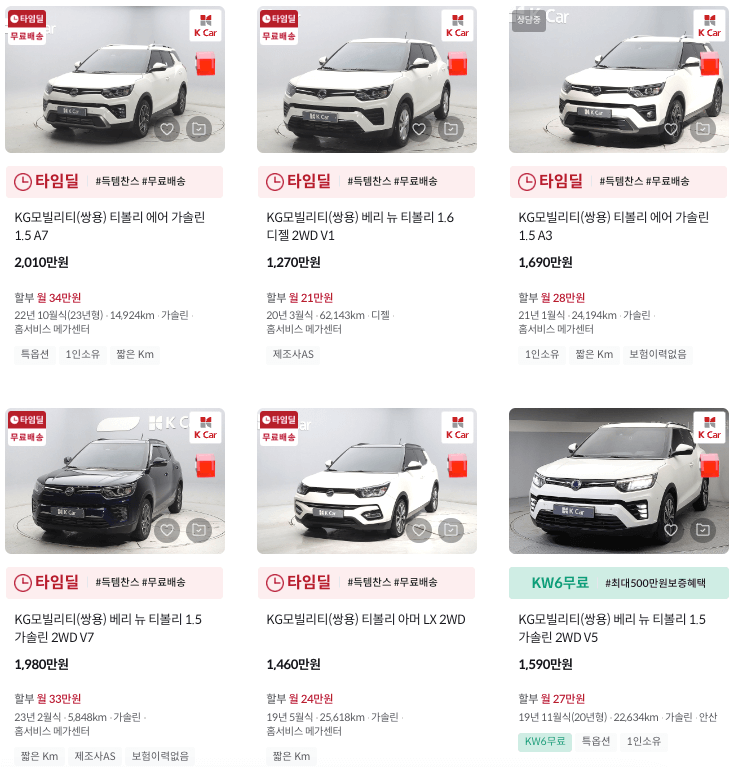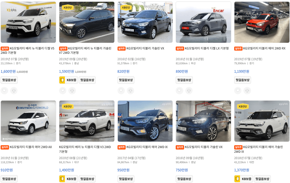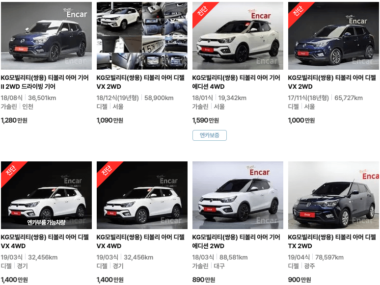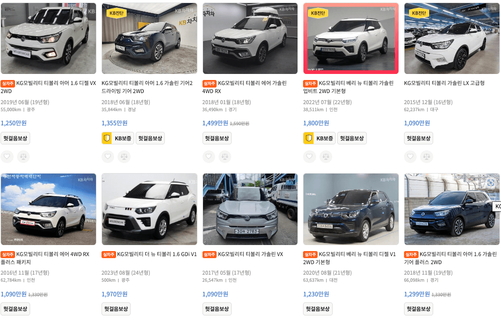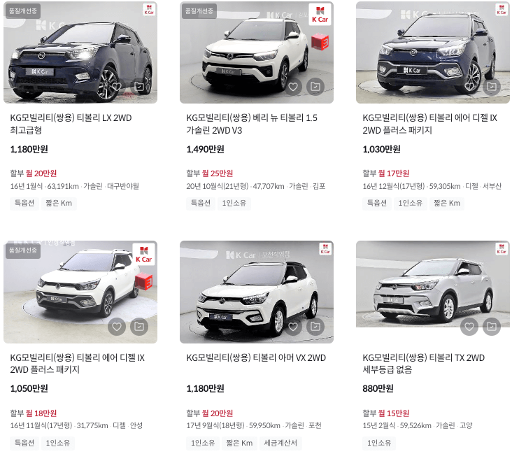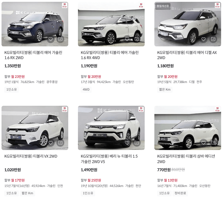 쌍용 티볼리 중고차 가격과 중고시세표입니다. 더 뉴 티볼리 에어, 신형, 아머  전체 모델과 2016년식부터 2024년식까지 연식별 깔끔히 정리했습니다. 쌍용 티볼리를 중고 구입할 예정이라면 중고시세 확인은 꼭 해야하겠죠.