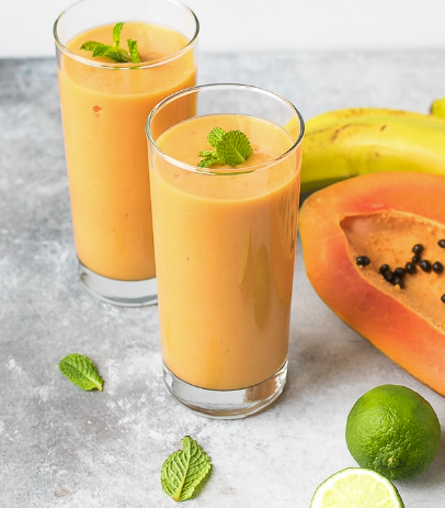 • 재료: 익은 파파야 1컵(다진 것), 바나나 1개, 무가당 아몬드 우유 1컵, 꿀 1티스푼 (선택 사항), 얼음 조각