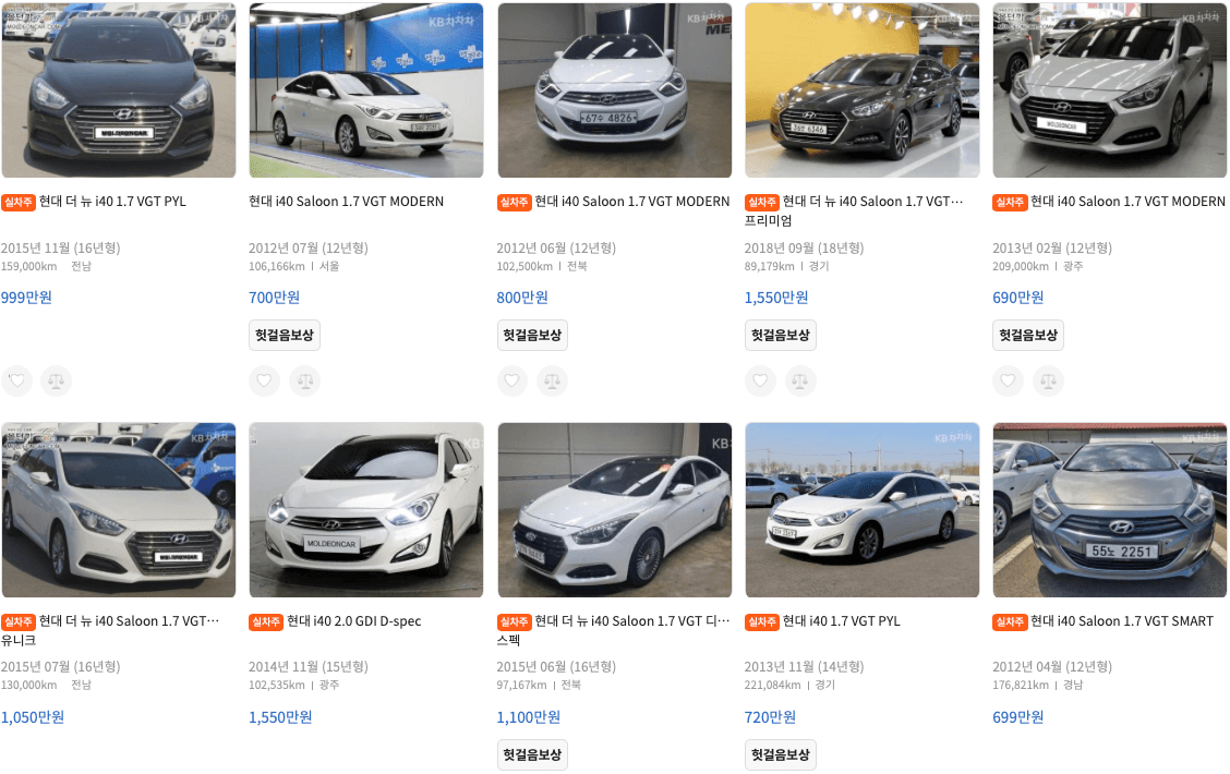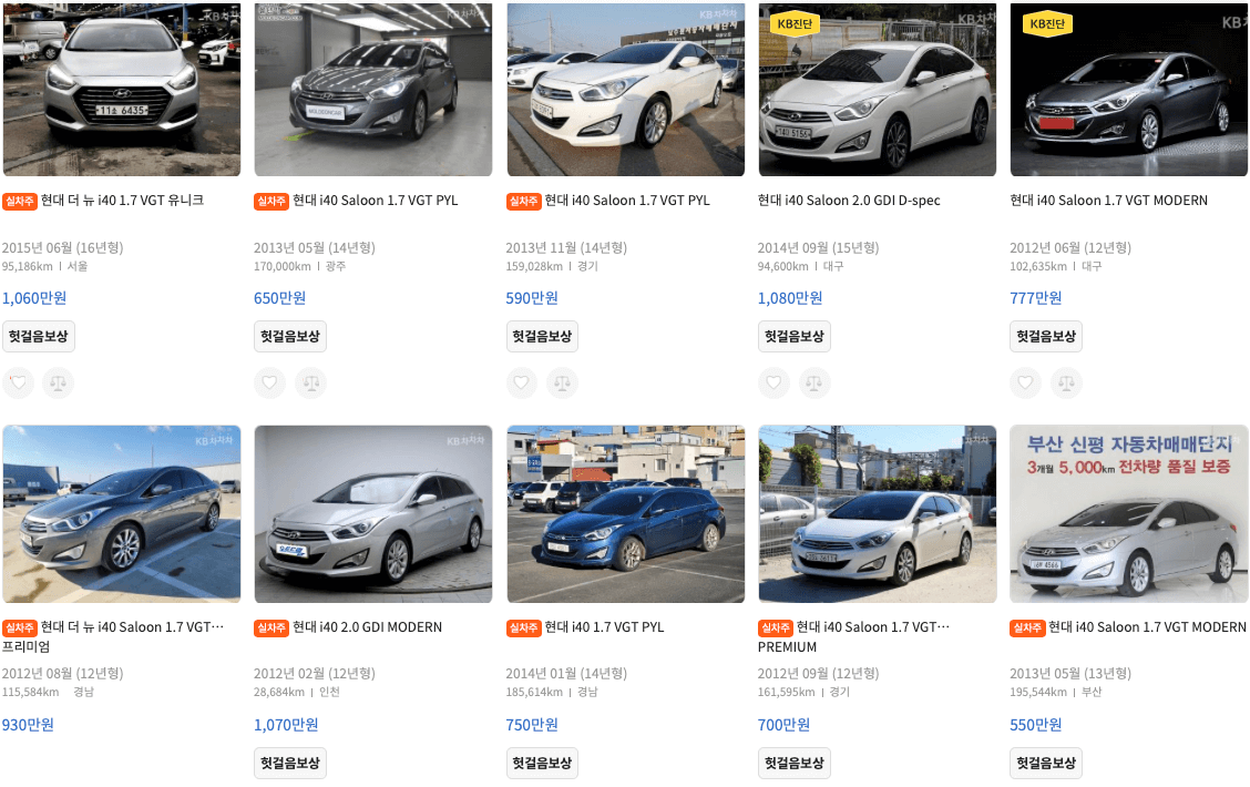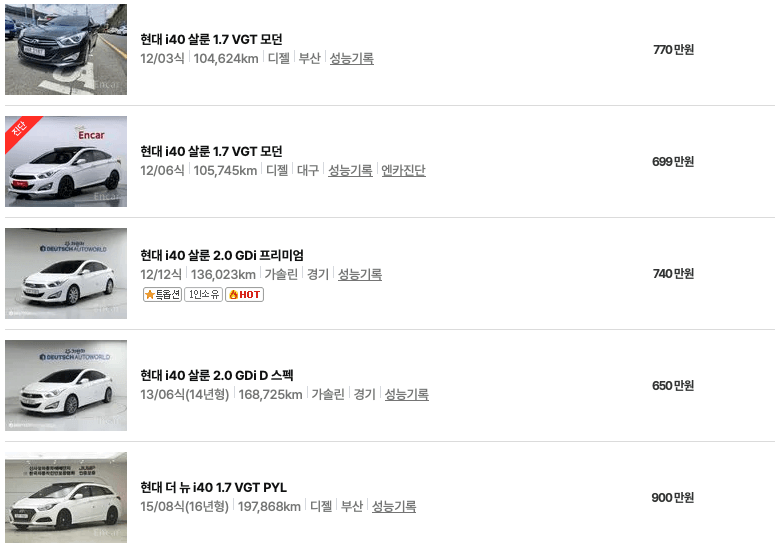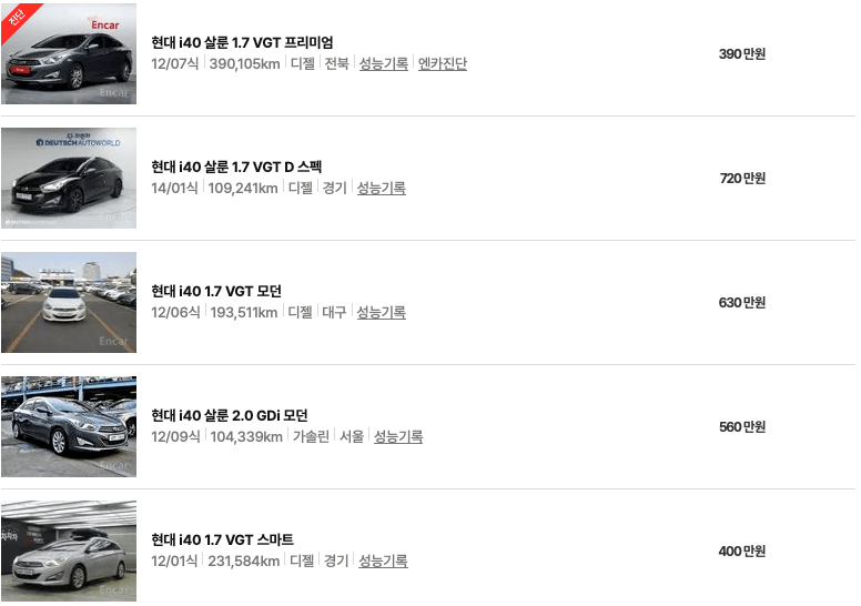 i40 모델별, 연식별 중고차 가격과 시세를 표로 정리했습니다.